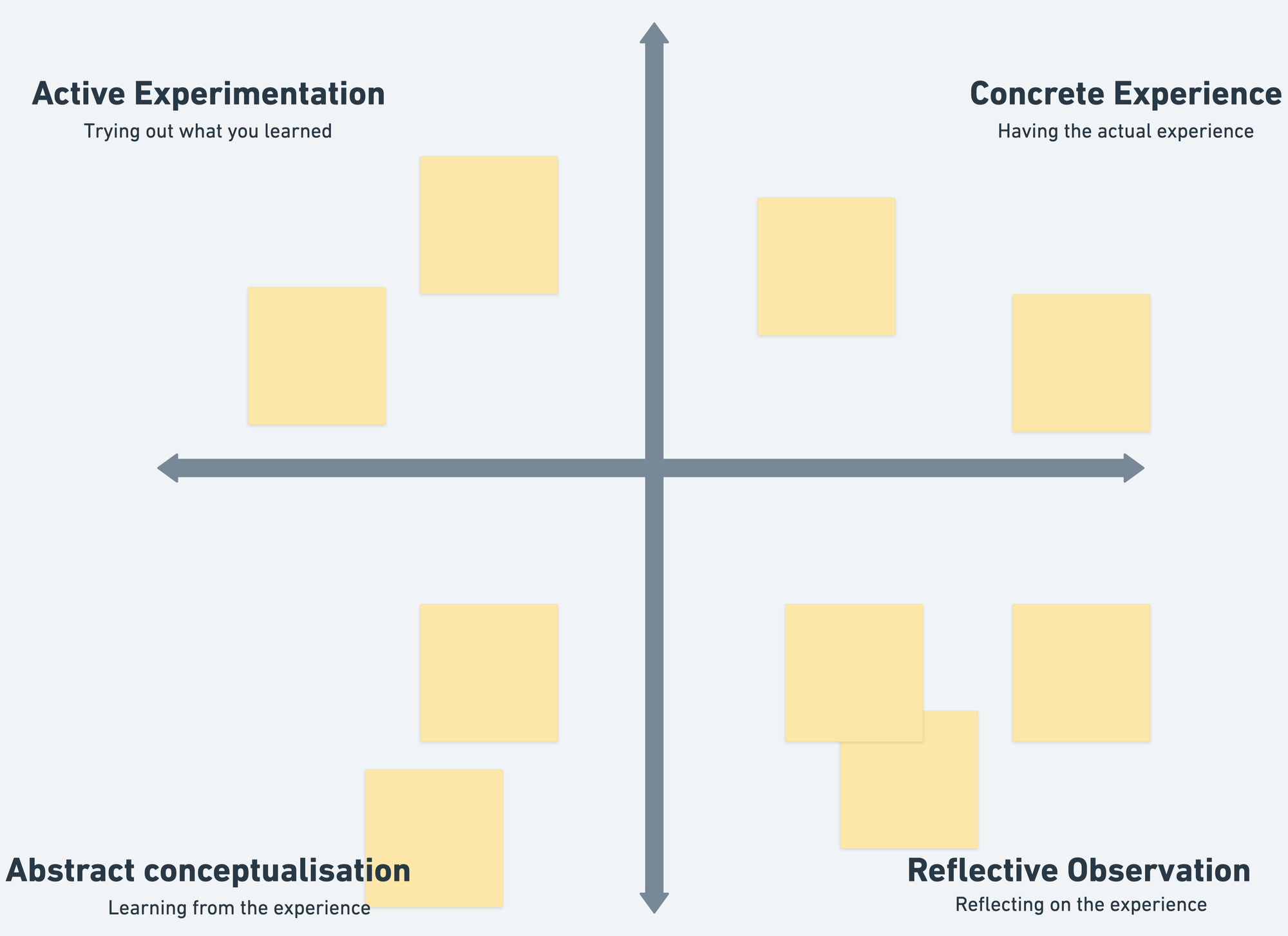 We can map the cycle of concrete experience, reflective observation, abstract conceptualization, and experimentation to writing sample code, reviewing and reading other people's code, learning from reading and writing code, and then using this learning in coding.