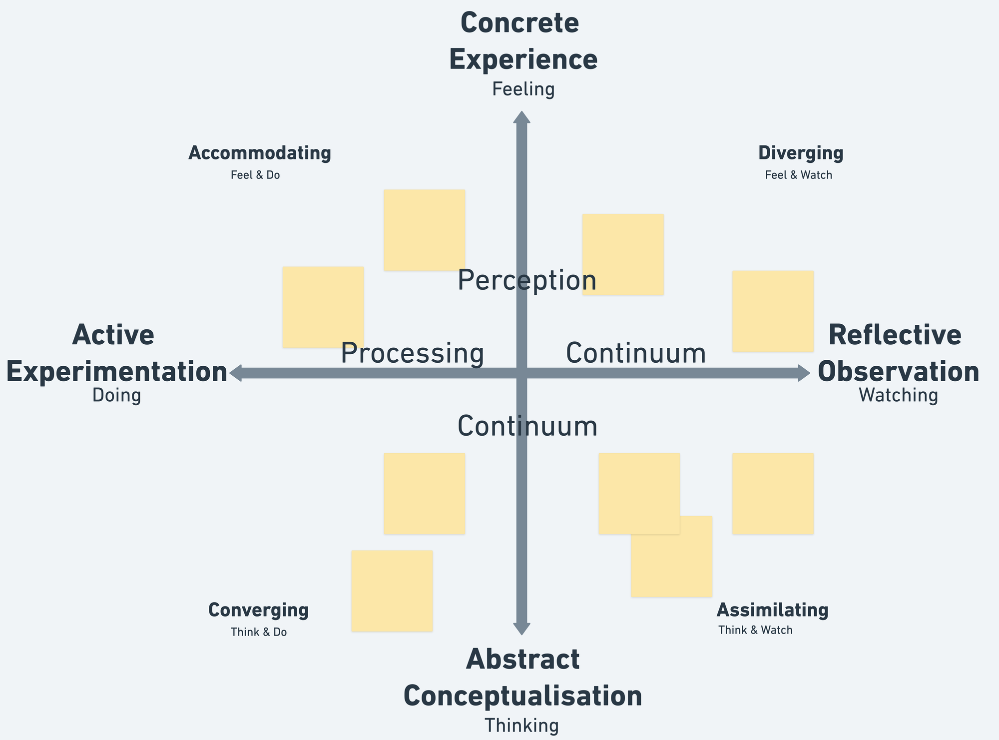 Additionally, he used the elements of the learning cycle to define learning style preferences. Diverging, Assimilating, Converging, and Accommodating learning styles are a combination of perception and processing continuum defined by Kolb.